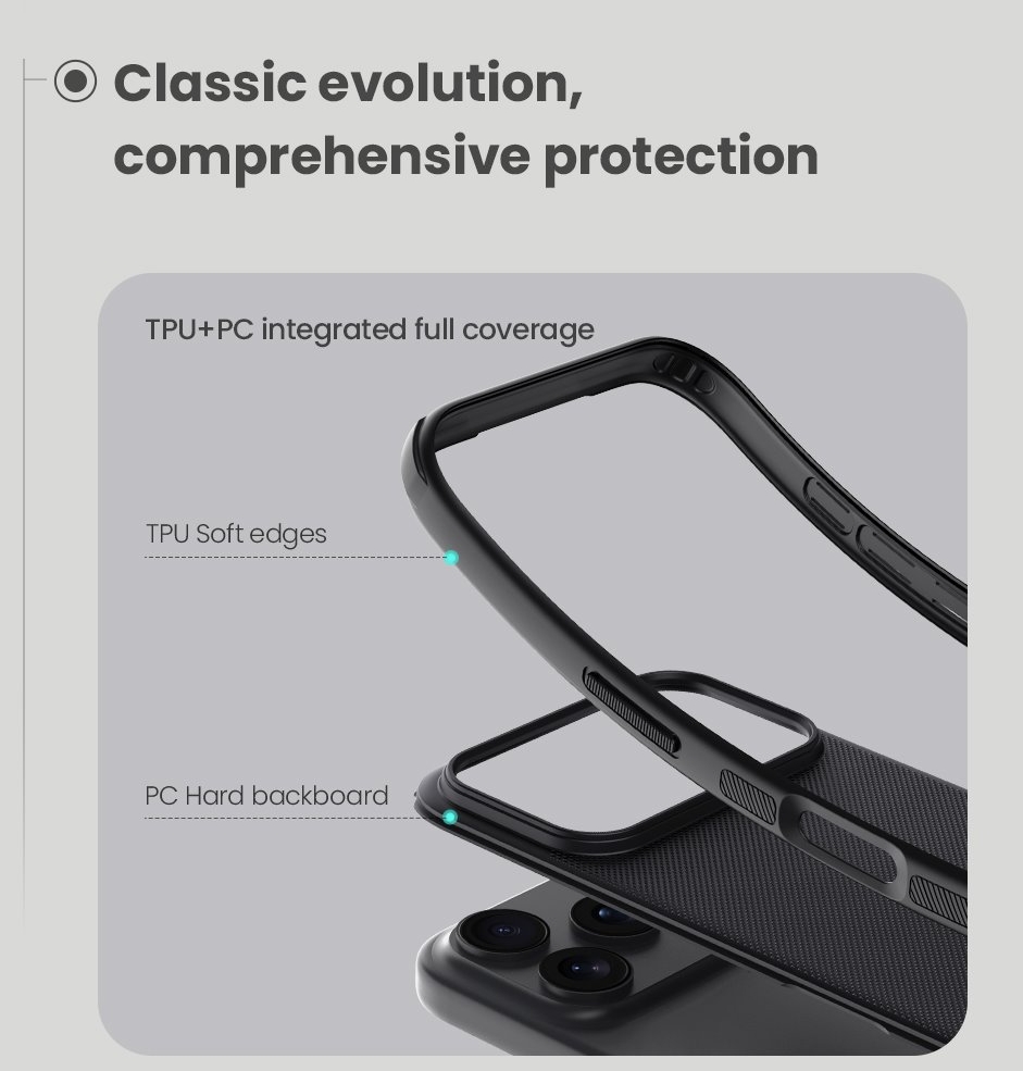 Skladá sa z tvrdého a odolného plastu na zadnej strane a TPU mäkkého plastu na bokoch.